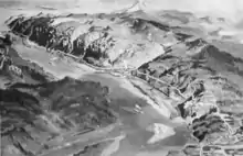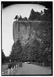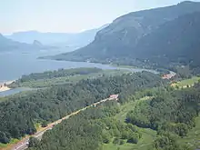 The Columbia River Gorge is the lowest crossing of the Cascade Mountains, carved by the Columbia River during the Cascades' uplift.[5] Rafting down the gorge from The Dalles was one of the most expensive and dangerous parts of the Oregon Trail, traveled by thousands of emigrants to the Oregon Territory, until the Barlow Road opened in 1846 around the south side of Mount Hood.[6] A wagon road was finally built through the gorge in the 1870s, when The Dalles and Sandy Wagon Road was constructed along the south shore from The Dalles to the Sandy River east of Portland. However, this road had steep (20%) grades and a crooked and narrow alignment, and it was not until 1882 that the Oregon Railway and Navigation Company finally opened a water-level route, partially destroying the wagon road. With the onset of the automobile and the good roads movement of the early 20th century, a road was once again needed, and Multnomah County began constructing a 20-foot (6 m) roadway with 9% grades, but ran into difficulties relating to the railroad's location. At Shellrock Mountain to the east, long believed to be an impassable barrier, Governor Oswald West used prison labor in 1912 to prove that it was possible to build a road, at least temporarily.[7]
