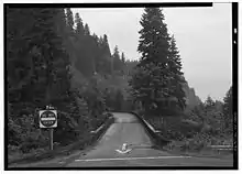 The final piece to The Dalles was laid out by J. H. Scott of the State Highway Department. It followed an inland route, climbing existing county roads to the Rowena Crest, where it used a third set of loops to descend to river level at Rowena. There it picked up a former alignment of the Oregon-Washington Railroad and Navigation Company most of the way to The Dalles.[20] Most of the bridges in Wasco County were designed by Conde McCullough, who would later become famous for his work on U.S. Route 101, the Oregon Coast Highway. A completion ceremony for the Columbia River Highway was held on June 27, 1922, when Simon Benson symbolically helped pave the final portion near Rowena. By then, the roadway was part of a longer Columbia River Highway, stretching from Astoria on the Pacific Ocean east to Pendleton as Highway No. 2 in a large network of state highways.[21] In the State Highway Department's fifth biennial report, published in 1922, it reported that construction costs to date on the Columbia River Highway totaled about $11 million, with the state contributing $7.6 million, the federal government $1.1 million, and the counties $2.3 million ($1.5 million of which was from Multnomah County).[22] In 1926, the American Association of State Highway Officials designated the road as part of U.S. Route 30.[23] The first realignment was made by 1935 at the west entrance to The Dalles, where a more direct route along West 2nd Street bypassed the old alignment along West 6th Street, the Mill Creek Bridge, and West 3rd Place.[24][25]