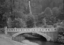 To carry rainwater off the road, Lancaster designed a comprehensive drainage system, including raising the center of the road, installing concrete curbs and gutters as on a city street, and taking the road over heavy flows on culverts. Eleven larger reinforced concrete bridges and several full or half viaducts were specially designed for the Multnomah County portion of the highway, taking the road over streams or along steep hillsides with a minimum of earthmoving. Masonry was used for retaining walls, which kept the highway from falling off the hillside, and guard walls, which kept drivers and pedestrians from falling off the road. At Oneonta Bluff, the highway passed through the first of five tunnels, as the land to the north was taken by the rail line. With the completion of the Oneonta Tunnel and a number of bridges, the road was open to traffic west of Warrendale, near Horsetail Falls, by October 1914.[10] In April 1915, Multnomah County voters approved the cost of covering the initial macadam with a patented long-lasting bituminous mixture known as Warrenite, which was completed to the county line by the end of the summer.[11]