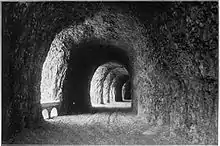 By the end of the 1940s, the original cross section of 18 feet (5.5 m) of pavement and two 3-foot (1 m) shoulders had been modified to 24 feet (7.5 m) of pavement. The Mosier Twin Tunnels were similarly widened from 8⅔ feet (2⅔ m) to 10 feet (3 m) in each direction in 1938 to accommodate larger trucks,[28] but this was not enough, and traffic signals were later installed at the tunnels to regulate one-way traffic. A 1948 bypass of the Oneonta Tunnel was made possible by moving the railroad slightly north on fill;[29] the railroad benefited by removing the risk of the thin tunnel wall collapsing onto the track.[30] Oneonta Tunnel was sealed in 1948 but revealed again fifty-five years later as part of the Historic Columbia River Highway restoration project.