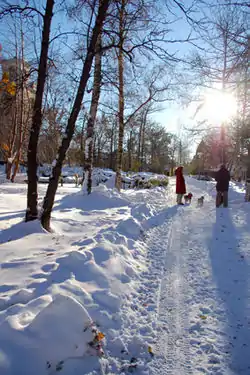 The state tried to persuade the Jamtish traders on Frösön to migrate to the new city but they had no intentions of leaving such a rich parish with the fertile soils Frösön consisted of in favor of the swamp and marshes across the strait. During its first 50 years the city's population only grew by an average of eight people per year.[1] The city became the county seat of the newly founded county consisting of the provinces Jämtland and Härjedalen in 1810, and a county council was established.[5] Though, Östersund remained a de facto farming village with fewer than 400 inhabitants in 1820.[6] The 1840s were slightly better when Jemtlands Tidning (Jämtland's first newspaper) was established, the first church was inaugurated, Frösö Trivial School was located to the city and a general hospital was built. An upswing occurred in the 1850s and 1860s, as trade was liberalized and the logging industry developed.