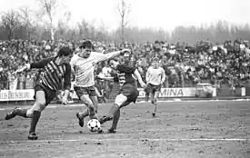 The players of BFC Dynamo had political training and were held under a strict discipline, demanding both political reliability, obedience and a moral lifestyle. No contacts with the West was allowed.[21][22][23] The players were also under surveillance by the Stasi. They would have their telephones tapped, their rooms at their training camp tapped and be accompanied by personnel from the Stasi during international trips.[24] The Ministry of the Interior and the Stasi had employees integrated in the club and it is likely that some individual players were recruited as informants, so called Unofficial collaborators (IM), with the task of collecting information about other players.[25][24] During an away trip to Belgrade for a match against Partizan Belgrade in the second round of the 1983-84 European Cup, players Falko Götz and Dirk Schlegel defected to West Germany. With help from the West German Consulate general in Zagreb, they received false passports and managed to escape to Munich.[26][27][28][29] East German state news agency ADN reported that Falko Götz and Dirk Schlegen had been "wooed by West German managers with large sums of money" and "betrayed their team".[28] Although Falko Götz and Dirk Schlegen were labeled as "sports traitors", their defection had little effect on the team. According to Christian Backs, the team only received more political training, and there were no reprisals.[21] However, the loss of two regular players before the match against Partizan Belgrade was a challenge. Coach Bogs decided to give then 18-year old Andreas Thom a chance to make his international debut, in replacement of Falko Götz. Thom would make a terrific debut.[28][27] BFC Dynamo won the match 2–0 and would eventually advance to the quarter finals.