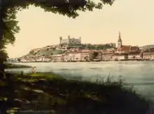 The town (the part below the castle) was conferred its first (known) town privileges by the Hungarian king Andrew III in 1291.[11] Earlier town privileges are not known, but probable, because Pressburg has been called a "town" as early as around 1250. After 1291, the town received many privileges from Hungarian kings, especially from the emperor Sigismund in the 15th century. After the death of the Hungarian king Andrew III, Pressburg was annexed by Austria in 1301, because Andrew's widow gave the town to the Habsburgs. The Habsburgs returned it to Hungary in 1322, but occupied it again later. It is only in 1338 that the town finally became part of Hungary again. In 1405 the town was declared a free royal town by King Sigismund of Luxemburg.[12] Not only Pressburg but all towns in Hungary got this status (meaning that they received "collective nobility", i.e. the status of a feudal lord with all its privileges) because Sigismund wanted to restrain the increasing power of the (true) feudal lords in Hungary. The Hussites first appeared in 1428, when they burned down the suburbs of Pressburg. Negotiations held a year later in Pressburg between Sigismund of Luxemburg and the Hussites (in April and in June) failed. Between 1432 and 1434 the Hussites tried to conquer the city but their attacks failed. The first bridge over the Danube in Pressburg was built in 1434, but it was destroyed by floods next year.[13] In 1434 and 1435 the amount of paymentsby Hungary, for which the Hussites would leave Slovakia, was officially negotiated. In 1436 Sigismund of Luxemburg awarded Pressburg the right to use its own coat of arms[14] and orders to improve the fortification of the castle (because of the last Hussite invasion during that year). From 1439 to 1486 another bridge over the Danube existed in Pozsony, being washed away by flood in 1486.[15]