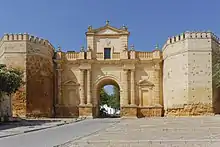 The Puerta de Sevilla (Seville Gate) and its bastion were built originally by the Carthaginians around 230–220 BC.[3] The Romans later made several modifications, focusing on reconstruction of the main access gate to the walled town, and modified the bastion itself, which, like the gate, still exists.