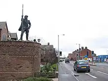 Evidence of burial practices is extremely rare. Inhumations have been found at Risehow, and possibly at Butts Beck (crouched individuals in pits and ditches) as well as two very rare cemeteries with multiple individuals (only approximately 30 Iron Age cemeteries exist in Britain in total) at Nelson Square, Levens and at Crosby Garrett.[52] The Butts Beck burial included the body of a 'warrior' along with his weapons and a horse (although this might have been a horse and cart burial, rather than a warrior one, with the wooden cart having rotted away).[53] The bog body at Scaleby[54] and the one at Seascale[55] are difficult to date, and, since the excavations were done in the 19th century and lacked today's archaeological techniques, the evidence for Druidical ritual sacrifice, as appears with some other bog bodies in Britain and Europe, is not present in the Cumbrian examples. However, both bodies were buried with a wooden stick or wand, which conforms to other bog-burial practice elsewhere. The finding of stone heads at Anthorn and at Rickerby Park, Carlisle, also conforms to the Celtic cult of the severed head and ritualistic sacrifice. This may be true also of the bronze buckets or cauldrons deposited at Bewcastle and at Ravenstonedale[56] which indicate connections with Ireland. The early name of Carlisle, 'Luguvalium', meaning 'belonging to Luguvalos', suggests a tribal chief in charge who had a personal name that meant 'strong as Lugus'. This indicates a possible affinity of the tribe there (perhaps the Carvetii) to the Celtic god Lugus, whose festival, Lugnasad, occurred on 1 August, accompanied by various sacrifices.