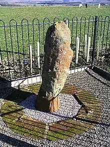 Some of the stones have designs (spirals, circles, grooves and cup-marks) on them which may have indicated the presence of other monuments or gathering-places and/or signalled the trackways and other routes through the landscape, particularly through the river valleys to sources of food, to ritual gathering places, or to sources of axes.[21][22]