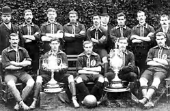 The 1890–91 season started in superb form with five straight victories, with Fred Geary scoring in each of the first six matches.[10] By mid-January, Everton had completed all but one of their fixtures and were on 29 points, while Preston North End were eleven points adrift with seven games still to play. Everton than had to sit out the next two months as Preston completed their fixture list until they were only two points adrift with one match each left to play. Both teams played their final games of the season on 14 March, with Everton losing 3–2 at Burnley (Geary scored both Everton goals) and Preston going down 3–0 at Sunderland.[11] Everton were thus able to win the Football League Championship for the first time, by a margin of two points with fourteen victories from their 22 league games. Geary had been ever-present, and was the club's top goal-scorer with 21 goals.