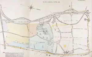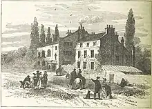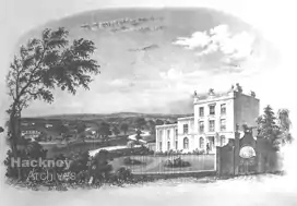 Just to the south of Harringay's present-day borders, a large mansion, Northumberland House, was built by 1824[28] just to the south of the New River on the east side of Green Lanes. The building, which was converted for use as a lunatic asylum as in 1826,[29] remained until the late 1950s when it was demolished and a council housing estate built on the site.