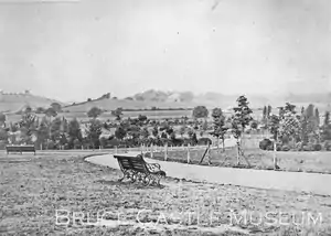 Through the grove, that protects the mansion from the west and surly north winds, are pleasant walks that traverse the grounds and communicate with the kitchen garden. Large evergreen trees and shrubs fringe this plantation, and produce shelter and other effects not to be disregarded in scenes of extent and of grandeur. The kitchen garden, about 1-acre (4,000 m2) and half-walled in, is seated on a sloping bank and furnished with a peach house and vinery pit 40 feet (12 m) long, and vinery pit 40 feet (12 m) long, and another pit of the same length for strawberries.[14]