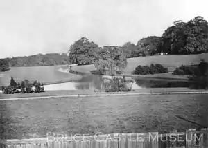 The house is a handsome and commodious residence seated on the summit of a conical hill and is surrounded on three sides by the New River. The broad open entrances to the gates, with an appropriate lodge at each side produces a first impression favourable to, and in character with, the interior scenes. From the winding and gently-rising approach, a large smooth knoll-like hill is seen in the south-west distance; its fine flowing outlines are bare of trees, but on the sloping grounds of the park arc groups of different sizes, one is composed of several trees, and another of only two trees, by which a moving panorama is displayed with every step of the beholder. On the other side is a fine oak tree and a large plantation. The road then enters the umbrageous foliage of a large group of trees composed of oak, elm, beech and birch, then over a bridge that spans a moat-like piece of water, through a winding avenue to the east front of the house.[14]