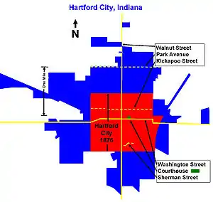 In the early 19th century, much of what would become the state of Indiana was still frequented by native Indian tribes.[2] At least three tribes are almost certain to have visited the future Hartford City area during the 40 years before the town was settled, although there were no known permanent settlements in the immediate area. The three tribes are the Miami, Delaware, and Potawatomi. A fourth tribe, the Kickapoo, may have lived in the area before the 19th Century, and Hartford City has a Kickapoo Street named in that tribe's honor.[3][4]