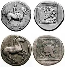 Archelaus I maintained good relations with Athens throughout his reign, relying on Athens to provide naval support in his 410 BC siege of Pydna, and in exchange providing Athens with timber and naval equipment.[54] With improvements to military organization and building of new infrastructure such as fortresses, Archelaus was able to strengthen Macedonia and project his power into Thessaly, where he aided his allies; yet he faced some internal revolt as well as problems fending off Illyrian incursions led by Sirras.[55] Although he retained Aigai as a ceremonial and religious center, Archelaus I moved the capital of the kingdom north to Pella, which was then positioned by a lake with a river connecting it to the Aegean Sea.[56] He improved Macedonia's currency by minting coins with a higher silver content as well as issuing separate copper coinage.[57] His royal court attracted the presence of well-known intellectuals such as the Athenian playwright Euripides.[58]