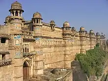 The Gwalior Fort at Gwalior was expanded by several dynasties during the medieval and early modern periods.