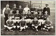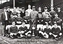 In January 1902, with debts of £2,670 – equivalent to £300,000 in 2022[2] – the club was served with a winding-up order.[3] Captain Harry Stafford found four local businessmen – including John Henry Davies, who became club president – each willing to invest £500 in return for a direct interest in running the club.[4] As a mark of this fresh start, on 24 April 1902, the club's name was changed to "Manchester United".[5][6] Under Ernest Mangnall, who became club secretary in 1903, the team finished as Second Division runners-up in 1906 and secured promotion to the First Division, which it won in 1908 – the club's first league title. The following season began with victory in the first ever Charity Shield[7] and ended with the club's first FA Cup title. Manchester United moved to a new stadium at Old Trafford in 1910, and won the First Division for the second time in 1911, but at the end of the following season, secretary Mangnall left to join Manchester City.[8]