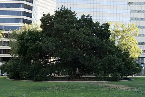 The Peralta ranch included a stand of oak trees that stretched from the land that is today Oakland's downtown area to the adjacent part of Alameda, then a peninsula. The Peraltas called the area encinal, a Spanish word that means "oak grove." This was translated more loosely as "Oakland" in the subsequent naming of the town, as recounted by Horace Carpentier in his first address as mayor: "The chief ornament and attraction of this city consists, doubtless, in the magnificent grove of evergreen oaks which covers its present site and from which it takes both its former name of 'Encinal' and its present one of 'Oakland.'" [6] The trees were California live oaks which are the dominant overstory plant of the coast live oak woodland habitat.