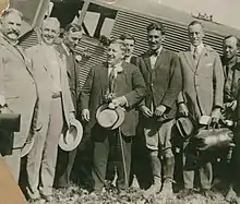 Russell Clifford Durant (called "Cliff" by his friends) was a race car driver, speedboat enthusiast, amateur flier, President of Durant Motors in Oakland, and son of General Motors founder William "Billy" Crapo Durant. In 1916, he established Durant Field at 82nd Avenue and East 14th Street.[23] The first experimental transcontinental airmail through-flight finished its journey at Durant Field on August 9, 1920, with Army Capt. Eddie Rickenbacker and Navy Lt. Bert Acosta (pictured right) at the controls of the Junkers F 13 re-badged as the model J.L.6.[24] The airfield served only secondary duties after 1927, as its runway was not long enough for heavily loaded aircraft. In April 1930, test pilot Herbert "Hub" Fahy and his wife Claire hit a stump upon landing, flipping their plane and mortally wounding Hub without injuring Claire.[25] Durant Field was often called Oakland Airport, though the current Oakland International Airport was soon established four miles (6.4 km) southwest.[26]