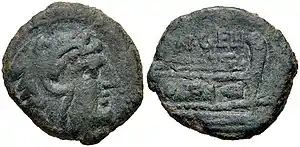 Gellius' only known magistracy was that of triumvir monetalis in 138, during which he minted denarii and bronze fractions (semis, triens, and quadrans). This denarius features on the reverse a quadriga led by Mars with a character beside him, which was initially thought to be Nerio—a goddess of Sabine origin that was the partner of Mars—but this view has been rejected by Michael Crawford and later historians, who argue the second character is only a captive.[7][1][8] The confusion arose from the fact that most of the knowledge on Nerio comes precisely from a rare fragment of Gellius' Annales.