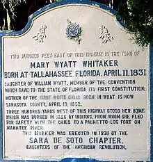 William Whitaker was the first documented pioneer of European descent to settle permanently in what became the village of Sarasota.[10] After time spent along the Manatee River at the village of Manatee, Whitaker built upon Yellow Bluffs, just north of present-day Eleventh Street. He sold dried fish and roe to Cuban traders working the coast and in 1847, he began a cattle business. In 1851, Whitaker married Mary Jane Wyatt, a member of a pioneer family who had settled the village of Manatee, that was about 13 mi (21 km) to the northeast along the river of the same name.