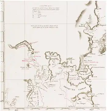 The country on the eastern side of the bay, is stony; and, wherever we landed, is wretchedly barren. The islands have a better appearance. Smooth Island, contains about one hundred acres of ground, that might answer for a garden: its soil is shallow and sandy.[8][9]