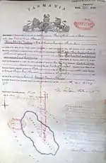 On 14 April 1863 Smooth Island, which was classed as agricultural Crown land at the time, was designated for sale at public auction on 23 April the following year, in accordance with the Waste lands Act. Several key clauses of the act were described.[28] It was initially listed for a minimum sale price of £227.[29] Thomas Gabriel Reid commissioned a detailed survey of the island which took place between 10 and 14 July 1863 (see survey report inset). It appears Thomas Gabriel Reid purchased the island on 21 April 1864 for only £155.[30] A "Thomas G. Read" was recorded as living in the nearby town of Sorell in 1866.[31] On 31 October 1894, Thomas Gabriel Read died at New Norfolk at 70 years of age. He was the second son of Captain G. F. Read.[32] Thomas Gabriel Read was a notable gold-miner. A detailed biography of Thomas Gabriel Read is available.[33]