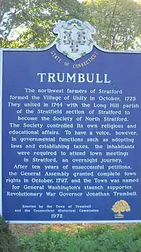 In 1744, Unity parish and the Long Hill parish of the Stratfield section of Stratford asked permission to combine and become the Society of North Stratford. The General Assembly referred to the eastern boundaries of Unity, at the time, as "ancient" when they approved the new town called North Stratford in 1744.[48] North Stratford remained as a village under the control of the town of Stratford for a period of 53 years until it became a part of the town of Trumbull in 1797.