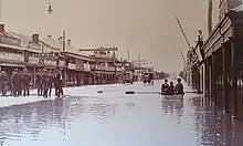 Flooding remained a common problem for Wagga Wagga, with major flooding occurring in 1844, 1852, 1853, 1870, 1891, 1900, 1925, 1931, 1950, 1952 and 1956. After the 1956 floods, the City Council protected the city area on the south flood plain through construction of a levee. The levee was completed by 1962 and provided protection from 1 in 100-year floods. North Wagga Wagga was excluded from protection, and attempts were made to force residents of North Wagga Wagga to abandon their homes through rigid enforcement of planning controls. North Wagga Wagga residents resisted the attempts to remove them and a sign mysteriously appeared beneath the North Wagga Wagga welcome sign with the wording – We Shall Not Be Moved. By the 1970s, the Council eventually acceded to residents' demands, removing planning constraints and a levee was constructed to protect the village, although at a lower standard, by 1982.[34] In 1981, the New South Wales government forced the amalgamation of Wagga Wagga City Council with neighbouring Kyeamba Shire and Mitchell Shire to form the new City of Wagga Wagga local government area, containing 4,886 square kilometres.[35]