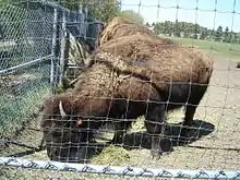 Preservation was the main focus of management up to World War II, which was accomplished by "feeding the bison, shooting carnivores that preyed on them, and patrolling for poachers."[34] As early as the 1870s, western ranchers James McKay and William Alloway were capturing bison calves and raising them alongside their herds of cattle, effectively domesticating the bison.[35] Some of these bison were sold in 1880 to Colonel Samuel Bedson, who let them roam the grounds of the Stony Mountain penitentiary in Manitoba.[36]