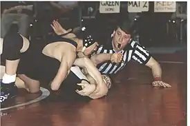 For most of the 20th century, collegiate wrestling was the most popular form of amateur wrestling in the country, especially in the Midwest and the Southwest.[1] Wrestling matches in the United States were early on particularly long, particularly among those in the Greco-Roman style. The matches most often took place in rings that were 20 feet square and set apart by three ropes. Some schools, such as Oklahoma State University, even had the wrestling rings raised on a platform, much like that of a boxing ring.[10] Although the rules of the AAU called for the referee to determine a winner after 15 minutes of wrestling if no fall occurred, the matches of the Eastern Intercollegiate Wrestling Association were finished by falls, even if it meant an hour or more of wrestling. By 1911, collegiate wrestling rules allowed the referee to determine a win in the absence of a fall after 15 minutes. The time limits have steadily decreased over the years of the 20th century.[7] Yet for more than forty years into the 20th century, freestyle and its American counterpart collegiate wrestling did not have a scoring system. The introduction of a point system by Oklahoma A&M wrestling coach Art Griffith that gained acceptance in 1941 influenced the international styles as well. The following year, collegiate wrestling would mandatorily take place on open mats laid flat on the gymnasium floor; the rings and ropes were now illegal. This further made collegiate wrestling distinct from its professional counterpart, which would soon become more entertainment than sport.[10][11]