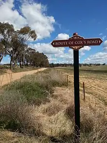 In 1823 Cox's original road was diverted just south of the present village of O'Connell through the future village of O'Connell and parallel to the east bank of the Fish and Macquarie Rivers, arriving at the village of Kelso on the eastern side of the Macquarie River, Bathurst town being immediately opposite on the western bank of the River. The original 1815 route passed parallel to the west bank of the Macquarie River through the Lagoon locality.