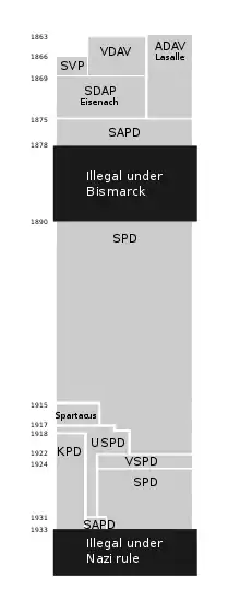 Faced with opposition from liberal capitalists to his socialist policies, Lassalle controversially attempted to forge a tactical alliance with the conservative aristocratic Junkers due to their communitarian anti-bourgeois attitudes as well as with Prussian Chancellor Otto von Bismarck.[5] Friction in the ADAV arose over Lassalle's policy of a friendly approach to Bismarck that had incorrectly presumed that Bismarck would in turn be friendly towards them. This approach was opposed by the party's faction associated with Marx and Engels, including Liebknecht.[39] Opposition in the ADAV to Lassalle's friendly approach to Bismarck's government resulted in Liebknecht resigning from his position as editor of Sozialdemokrat and leaving the ADAV in 1865. In 1869, August Bebel and Liebknecht founded the Social Democratic Workers' Party of Germany (SDAP) as a merger of the petty-bourgeois Saxon People's Party (SVP), a faction of the ADAV and members of the League of German Workers' Associations (VDA).[39]