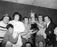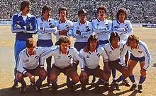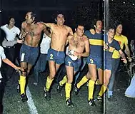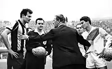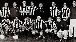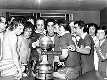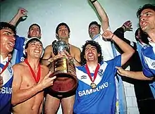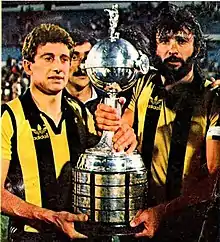 Estudiantes, a modest neighborhood club and a relatively minor team in Argentina, had an unusual style that prioritized athletic preparation and achieving results at all costs.[20][21][22][23] Led by coach Osvaldo Zubeldía and a team built around figures such as Carlos Bilardo, Oscar Malbernat and Juan Ramón Verón, went on to become the first ever tricampeón of the competition.[24][25][26][27] The pincharratas won their first title in 1968 by defeating Palmeiras. They successfully defended the title in 1969 and 1970 against Nacional and Peñarol, respectively.[28][29] Although Peñarol was the first club to win three titles, Estudiantes was the first to win three consecutive titles.