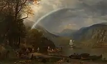 Hudson River School paintings reflect three themes of America in the 19th century: discovery, exploration, and settlement.[48] The paintings also depict the American landscape as a pastoral setting, where human beings and nature coexist peacefully. Hudson River School landscapes are characterized by their realistic, detailed, and sometimes idealized portrayal of nature, often juxtaposing peaceful agriculture and the remaining wilderness, which was fast disappearing from the Hudson Valley just as it was coming to be appreciated for its qualities of ruggedness and sublimity.[49] In general, Hudson River School artists believed that nature in the form of the American landscape was an ineffable manifestation of God,[50] though the artists varied in the depth of their religious conviction. They took as their inspiration such European masters as Claude Lorrain, John Constable and J. M. W. Turner.[51] Their reverence for America's natural beauty was shared with contemporary American writers such as Henry David Thoreau and Ralph Waldo Emerson.[52] The Düsseldorf school of painting had a direct influence on the Hudson River School.[53]