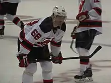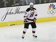 In the 2011 off-season, Lemaire was replaced by former Florida Head Coach Peter DeBoer.[88] After winning the 2011 NHL Entry Draft lottery, the Devils drafted defenseman Adam Larsson fourth overall along with several other key prospects. In addition to drafting and later signing Larsson, the Devils traded away veteran forward Brian Rolston while signing former Devils "A-Line" star Petr Sykora to a one-year contract.[89][90] The Devils team continued to grow and develop during the regular season, while the Devils' offense came out strong in DeBoer's new system.[91] Led by Ilya Kovalchuk, Patrik Elias and Zach Parise, the team posed a significant offensive threat that year, bearing seven 40-point scorers by the season's end. The Devils' special teams was also notably exceptional, breaking an NHL record for the best regular season penalty kill since before the Expansion Era.[92] Important late season acquisitions, including defenseman Marek Zidlicky (who was traded for three players and two draft picks) and winger Alexei Ponikarovsky (who was traded for a player and a draft pick), became valuable assets during the later months and the post-season, with Zidlicky becoming the Devils' key offensive defenseman on the power play.[93][94] Kovalchuk and Elias both finished as League top-ten point scorers during the regular seasons, with 83 and 78 points, respectively. Forwards Kovalchuk, Parise and David Clarkson all scored over 30 goals during the regular season while rookie forward Adam Henrique totaled 51 points and earned a Calder Trophy nomination for NHL rookie of the year.[95]
