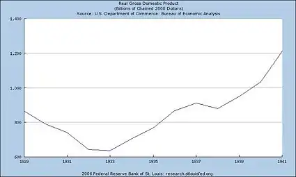The Wall Street Crash of 1929 and the ensuing Great Depression led to government efforts to restart the economy and help its victims. The recovery, however, was very slow. The nadir of the Great Depression was 1933, and recovery was rapid until the recession of 1938 proved a setback. There were no major new industries in the 1930s that were big enough to drive growth the way autos, electricity and construction had been so powerful in the 1920s. GDP surpassed 1929 levels in 1940.