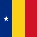 The colors of the national flag of Romania (Romanian: Drapelul României) has a long history, though the association of the three colors only dates to the 18th century. Red, yellow and blue were found on late 16th-century royal grants of Michael the Brave, as well as shields and banners.[1] Thus, the late 13th century Wijbergen armorial shows the coat of arms of the Wallachian ruler Litovoi as consisting of a shield of ten vertically alternating gold-and-red bands,[2][3][4] which were the colors of the coat of arms of the Second Bulgarian Empire, of which Wallachia was part. The same two colors, gules and or, also appeared on the late 15th century flag and coat of arms of Moldavia, during the reign of Stephen the Great . Then, from the late 16th century until the mid-17th century, the historical coat of arms of Transylvania gradually developed as a shield party per fess, consisting of a black eagle on blue background in the upper field, a dividing red band in the middle, and seven red towers on golden background in the lower field.[5][6] Finally, in the last quarter of the 18th century, Bukovina gets its own coat of arms from the Habsburg Empire, a blue-and-red shield party per pale with a black aurochs' head in the middle, and three golden six-pointed stars surrounding it.[3] During the Wallachian uprising of 1821, these three colors were present, along others, on the canvas of the revolutionaries' flag and its fringes; for the first time a meaning was attributed to them: "Liberty (sky-blue), Justice (field yellow), Fraternity (blood red)".[7]
