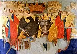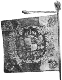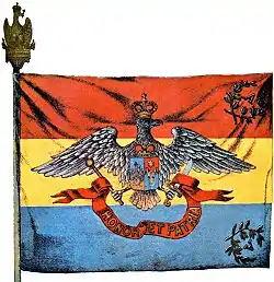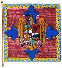 The resulting designs, distributed on 1 September 1863, differ somewhat from those legislated in March. This, the Roman eagle, wings outstretched, wearing the princely crown, carries the princely scepter in its right talon and the sword in its left; on its breast appears an open shield topped by the princely crown. On the left of the shield, over azure and gold, is the Wallachian eagle (a cross in its beak, in left profile and wearing the princely crown); on the right, over red and azure, is the Moldavian aurochs with a star between its horns. Hanging from the scepter and sword is a red ribbon with gold-embossed letters: "HONOR ET PATRIA" ("honor and Fatherland").[44] In the fly corners the prince's initial is stitched, surrounded by a laurel wreath; all are golden. Each flag also had inscribed the unit that bore it.[45] The cloth part was 122 centimeter long and 100 centimeter wide.[46] A metal Roman eagle was affixed to the tip of the flagpole.[47] Although the order of 19 March had the Moldavian symbol in the right, nevertheless the first on the shield is the Wallachian eagle. The design was most likely adopted due to customary usage that arose after Bucharest became the single capital in February 1862.[48]