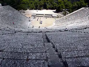 Greek theatre, most developed in Athens, is the root of the Western tradition; theatre is a word of Greek origin.[2] It was part of a broader culture of theatricality and performance in classical Greece that included festivals, religious rituals, politics, law, athletics and gymnastics, music, poetry, weddings, funerals, and symposia.[6][lower-alpha 1] Participation in the city-state's many festivals—and attendance at the City Dionysia as an audience member (or even as a participant in the theatrical productions) in particular—was an important part of citizenship.[7] Civic participation also involved the evaluation of the rhetoric of orators evidenced in performances in the law-court or political assembly, both of which were understood as analogous to the theatre and increasingly came to absorb its dramatic vocabulary.[8] The theatre of ancient Greece consisted of three types of drama: tragedy, comedy, and the satyr play.[9]