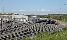 Hitachi Newton Aycliffe (also known as Newton Aycliffe Manufacturing Facility[1]) is a railway rolling stock assembly plant owned by Hitachi Rail Europe, situated in Newton Aycliffe, County Durham, in the North East of England. Construction started in 2013 at a cost of £82 million, with train assembly commencing in 2015.[2] It was the first factory that Hitachi built in Europe, as a result of it winning the Intercity Express Programme tender.[3] Originally on opening, no actual manufacturing operations took place at the site; it assembled components built elsewhere into completed trains. However, for the later classes, some manufacturing took place on site. By October 2017, the plant employed over 1,000 members of staff.[4][5]