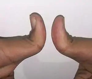 Hitchhiker's thumb, also known as distal hyperextensibility of the thumb is the condition of having a thumb that has a distal phalange that bends backwards in an angle of 90°, it is thought to be inherited in an autosomal recessive manner, however, it presents on genetic disorders that are inherited in an autosomal dominant manner[1] This condition is benign (when isolated) and does not cause pain or affect the thumb with the trait negatively.