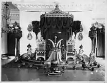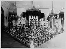 Hoʻokupu is a Hawaiian language term for gifts and offerings. The ceremony dates back hundreds of years, to a time when the average Hawaiian subsisted on manual labor, with little-to-no financial assets. Their gifts were literally the fruits of their personal labors to the Hawaiian aliʻi (rulers), or to visiting royalty. Through time, the gifts became more monetary based and a part of the monarch's wealth. Although they were allowed to approach the monarch with the gifts, they were handed to a royal attendant so as not to touch the aliʻi.[1] In 1869, the visiting Duke of Edinburgh Prince Alfred was accorded a hoʻokupu by Kamehameha V, and broke with protocol by reaching out to touch any gift-giver who wished to shake his hand.[2]
