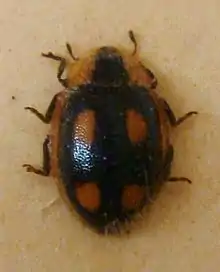 The species' colouration is black and orange: its head is orange on each side with black running down the middle, while its elytra or wing cases (which cover the back) are orange around the edge with black covering much of the area. It has four orange dots on this black area, two on each elytron. It is about 4 mm long from the tip of the head to the end of the abdomen (description based on a life-size photo in Andrew Crowe's Which New Zealand Insect).[2]