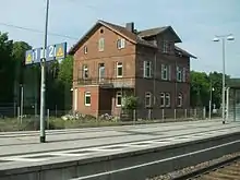 Like all other station buildings built in the Palatinate around 1870, the entrance building was built in the neoclassical style. So it resembles Albersweiler and Langmeil stations.[20] It was comparatively large and is now disused.[12] Just west of it is a former auxiliary building made out of sandstone. Several signal boxes were abandoned after the Second World War. That at the overpass over federal highway 48 was renovated and converted into a restaurant.[21] This was built during the period of Deutsche Reichsbahn and consists of natural sandstone. The roof is made of natural slate.[22]