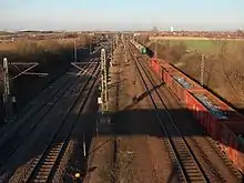 To make room for the new line and the existing line to be bundled together, the Rhine Railway was moved 130 metres to the west during the construction work. Bundesstraße 36 (federal highway 36) was included in the infrastructure bundle, which was intended to minimise environmental impacts.[4] According to Deutsche Bahn, the noise of the town has been reduced to a quarter by the bundling of the routes together and additional mitigation measures.[11] The route formerly used by Rhine Railway was re-vegetated. The town of Hockenheim planned (as of 1988) to integrate recreational facilities in this green space.[12]