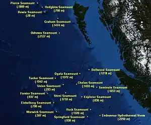 ![]() Map of submarine volcanoes on the coast of British Columbia, including Hodgkins Seamount | |