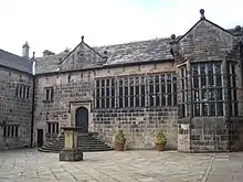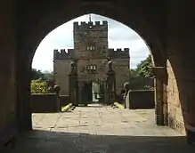 The house is approached by a long straight drive leading eastwards from the A675 road. It passes through a pair of gate piers about 200 yards (183 m) west of the house.[24] Between these gates and the entrance to the outer courtyard is a grassed area known as the Tilting Ground, which is enclosed by a wall on the south side and the Great Barn to the north. On the east side of the house is a walled garden, known as the Wilderness, and on the south side are smaller walled gardens, the Rose Garden and the Rampart Garden.[19] The Great Barn is constructed in sandstone with a slate roof, and incorporates a carthouse. It is dated 1692, and has ball finials on its gables. To the northwest of the house are the coach house and stables, also in sandstone, and dating from the 17th or early 18th century. A small cupola was added to it in the 19th century. At the entry to the drive on the main road is Paley and Austin's lodge of 1878.[19]