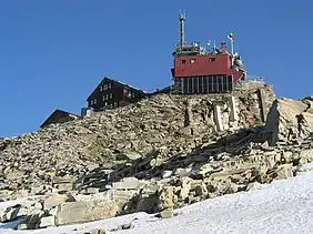 On the steep summit, at a height of 3,106 metres, is a meteorological observatory, the Sonnblick Observatory, and an Alpine refuge hut, the Zittelhaus (also written Zittlhaus). At a height of 2,718 metres is the Rojacher Hut and at 2,175 metres is the Schutzhaus Neubau. Both huts are managed during the summer months.
