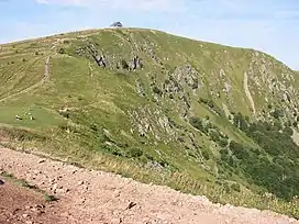 The Hohneck is, at 1,363 m (4,472 ft) the third highest summit of the Vosges Mountains (after Grand Ballon [1,424 m, 4,672 ft] and Storkenkopf [1,366 m, 4,482 ft]) and the highest point of Lorraine.[3] On its summit stands a mountain hut, clearly visible in the distance. Nearby the mountain's top is located the ski resort of La Bresse Hohneck.
