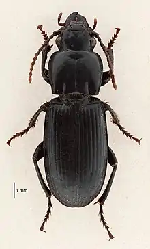 Holcaspis brevicula, the Eyrewell ground beetle,[2] is a species of carabid beetle native to New Zealand, one of a number of small black flightless beetles in the genus Holcaspis that inhabit the dry eastern lowlands of the South Island. H. brevicula is very rare—only ten specimens have ever been collected—and critically endangered: the species was found only in Eyrewell Forest, a single plantation of exotic pine trees currently being converted into dairy farms.