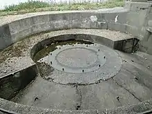 One type of holdfast is a concrete base or plinth that a gun is bolted to.[1] These were used, for example, to secure coastal battery guns in pillboxes during World War II.