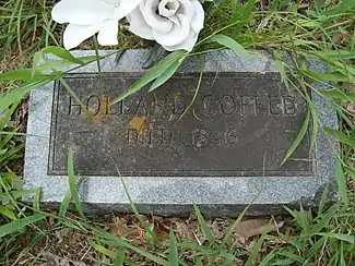 Holland Coffee (born 15 August 1807)[1] was an American trader, guide, interpreter, and representative of Fannin County. He was involved with the settlement of present-day Lake Texoma area and acted as a liaison between the native west and Caucasian settlers.[2] Coffee was known chiefly for his trading and relations with Native American tribes such as the Comanches, Kiowa, Caddo, Wichita, and Delaware, and his many trading posts established in places such as Tillman, Love, and Cotton Counties.[2] While Coffee was known for his prosperity, his land expansions brought along debt as well.[2]